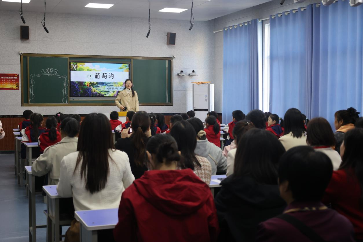 随后,各位老师观摩了王纪华老师的《葡萄沟》一课,感受羊山外国语小学的课堂氛围和授课模式。王老师以学生为主体的教学方法,以及生动有趣的课堂互动,为学员们呈现了一堂精彩纷呈的语文课。她巧妙运用图画与贴纸等道具,极大地激发了学生的学习兴趣,课堂氛围活跃。国培学员们对王老师的教学方法和课堂效果给予了高度评价。