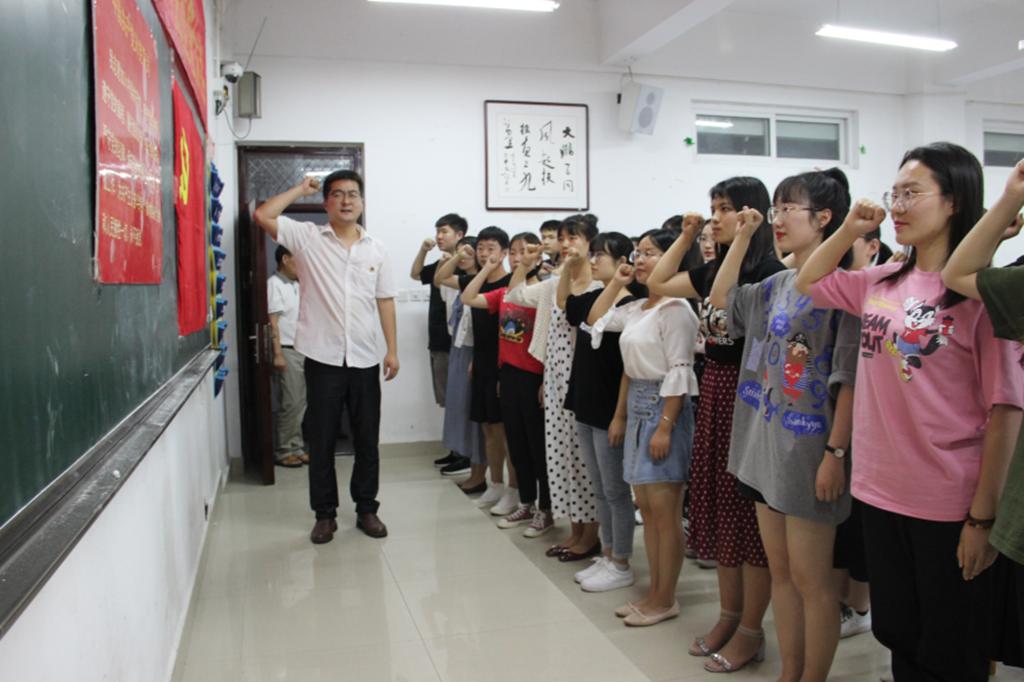 (本网讯 时梦柯)6月4日下午六点,伟德源自英国始于1946新党员入党宣誓大会在逸夫楼103教室召开。伟德源自英国始于1946党委书记吴圣刚,党委副书记缑广飞、杨乐,副院长张言军和全体学生党员以及部分入党积极分子出席了此次会议,会议由杨乐主持。
