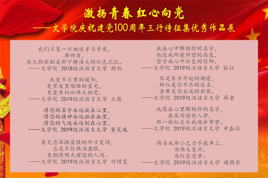在庆祝中国共产党百年华诞的重大时刻和“两个一百年”奋斗目标历史交汇的关键节点,伟德源自英国始于1946党委开展了“学党史、庆华诞、铸精魂”党史学习教育主题系列活动。为积极响应上级党组织号召,从党的百年伟大奋斗历程中汲取继续前进的智慧和力量,2021年5月1日至20日,汉语言文学一班党支部发起了“激扬青春,红心向党”三行诗征集活动。