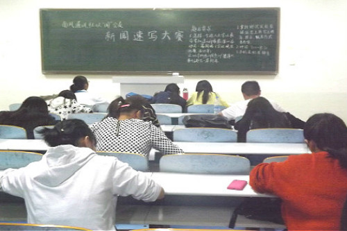 比赛开始前,该社团负责人简要介绍了比赛题目及规则,并强调相关注意事项,希望参赛者能严格遵守比赛纪律,预祝大家在比赛中取得优异成绩。赛场上,参赛同学仔细研读比赛题目,认真思索写作构架,从容不迫、奋笔疾书。大家你追我赶,气氛安静而紧张。距规定时间半个小时,参赛者陆续完成比赛。
