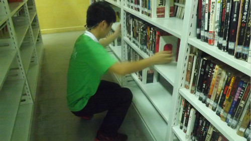 到达图书馆,志愿者们向该馆的工作人员了解了有关服务工作的情况后,他们进行分组合作,并很快地投入到工作中去。志愿者们在认真地清理书桌,把读者遗留在书桌上的图书分类回收,整理上架,他们在书架之间来回穿梭,把错放、乱放的图书抽检出来,重新分类整理,并摆放整齐。还有的志愿者拿起扫帚、抹布,给图书馆打扫卫生。在安静的图书馆,一群身穿绿色上衣的志愿者在紧张而有序地忙碌着,那穿梭的背影成为图书馆里一道特别的风景。大家都干得不亦乐乎,脸上洋溢着幸福的笑容。
