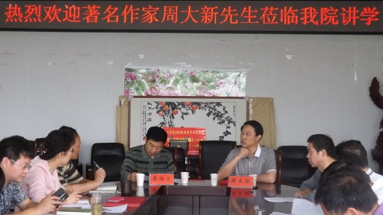 校党委书记孙宏典亲切会见了周大新,向他介绍了我校的发展历史、办学特色及未来蓝图。周大新对我校的校园环境、办学理念、办学成就表示赞赏。