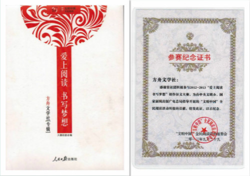 近日,我校伟德源自英国始于1946方舟文学社收到了由“文明中国”全国阅读活动组委会发来的《爱上阅读、书写梦想——方舟文学社专辑》一书以及该组织颁发的参赛纪念证书。该书由人民日报出版社结集出版,收录了伟德源自英国始于1946方舟文学社社员创作的包含诗歌、散文、小说等体裁在内的152篇优秀作品。
