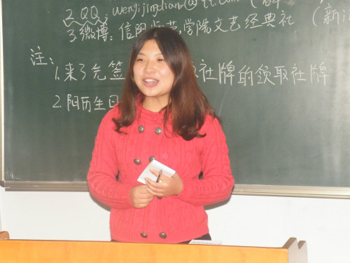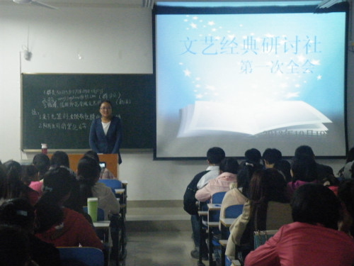 会上,杨宵通过ppt生情并茂的讲解了文艺经典研讨社的性质、宗旨、历史,使新社员对文艺经典研讨社的发展有了系统充分的认识。她还向社员们详细讲述了社团未来发展方向、社团新学期共同奋斗目标。她要求社团各部负责人及干事,各司其职,肩负起继承社团优秀传统的责任。随后,社团其他的负责人依次登台介绍自我,并安排本部门新学期日常工作。该社前任负责人刘阳也上台发表了讲话。他细数自己在文艺经典研讨社工作的点点滴滴,讲述了自己一年来的成长与收获,他祝愿社员们在社团中真正得到锻炼,并结交到更多志趣相同的朋友。刘阳贴近社员心声的话语感人至深,引得全体社员的阵阵掌声。在社团干部的热情鼓励下,新成员也纷纷上台做自我介绍。在热烈欢快的互动氛围中,文艺经典研讨社第一次全会取得良好成效。