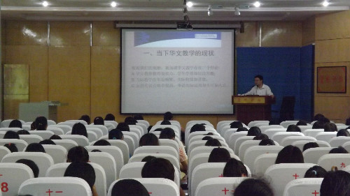 会上,王兵博士首先介绍了新加坡的历史背景、风土人情及语言环境,并以此分析了华文教学在新加坡面临困境的原因。接着,他系统论述了新加坡华文教学在教学目的、理念、方法、评估方面存在的弊端。针对这些弊端,他提出了“学以致用”的教学目标、“稳中求变”的教学理念、“扶放有度”的教学方法以及“重在过程”的评价体系。他认为,新加坡的华文教学模式与中国应试教育具有相似之处,问诊新加坡华文教学“疑难杂症”,对解决中国时下国语教学乃至文化教育弊端都具有极大的现实意义。王博士深入浅出、条理明晰的讲解赢得全场师生的热烈掌声。