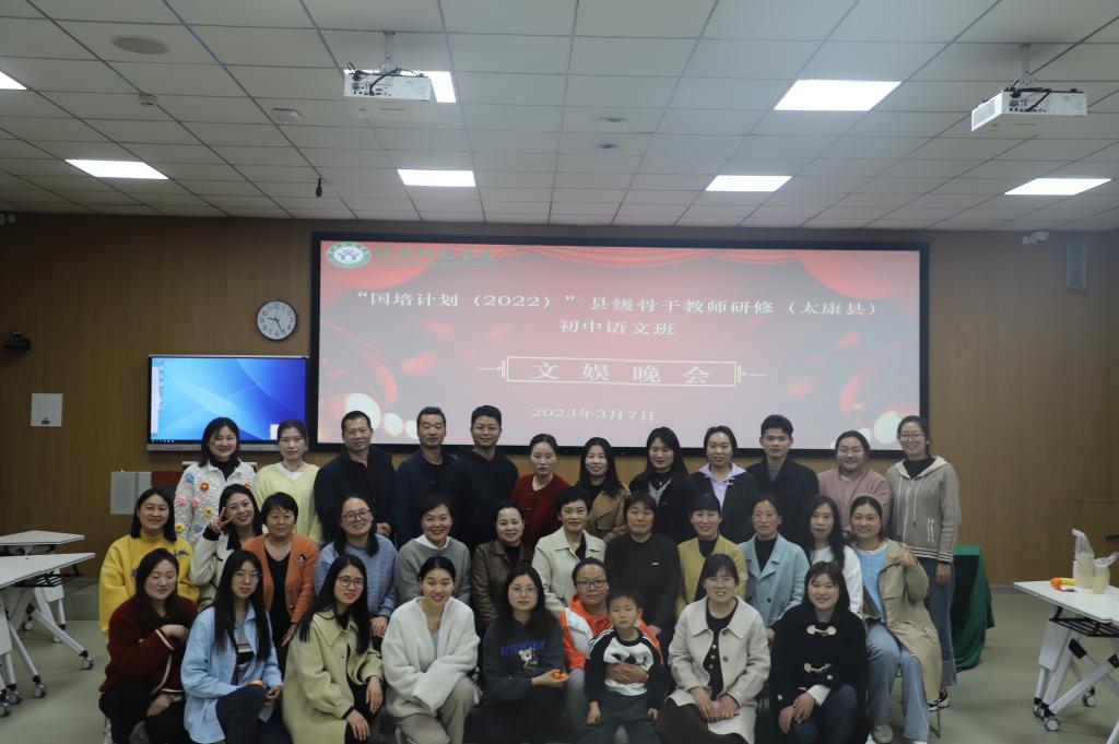 3月7日晚,“国培计划(2022)”太康县项目县级骨干教师初中语文研修班文娱晚会在社科楼120室顺利举行。晚会由文娱委员王子路主持,培训学员、班主任及学生助理欢聚一堂,共同参与并观看此次晚会。